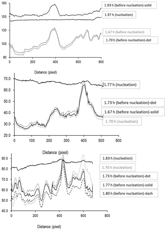ImageJ software was used to extract these intensity values, allowing the construction of plots showing the mean vertical intensity across the width of the ROI for three samples (the intensity value for the middle line on the ROI was also determined). The first set of intensity profiles is shown for the time period up to the onset of ice formation (Figure 6). Before ice nucleation, the profiles are erratic with multiple spikes (largely due to specular reflections from the glass surface), then at the point of ice nucleation, when the image becomes translucent as ice nuclei are seeded across the entire liquid volume, the profile jumps to higher intensity values that become more consistent across the image.