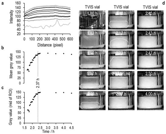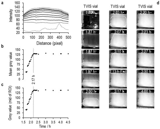 In the Figure 7, Figure 8 and Figure 9 that follow, (a) is the average pixel intensity in the vertical direction of the image plotted on the y-scale as a function of x-scale position across the image. Each line represents a new image acquired at each point in time during the freezing of ice. The lowest solid grey line is in the liquid state, the lowest black dotted line in the first image in which the opacity from ice nucleation characterizes the image, and thereafter, the black lines follow the increase in pixel intensity as the ice front moves up the vials, until the next grey line marks the end of ice solidification, with the highest dotted line being the end of the image acquisition period; (b) Is the average value for each line as a function of time; (c) Is the middle value of the pixel intensity as a function of time, and (d) are a selection of images every 2 min through the ice formation process.
