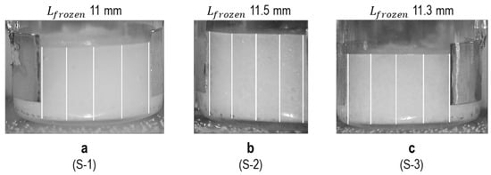 where is the time point at which ice completes solidification, and is the time point where nucleation is initiated. The freezing profile of (10 Hz) parameters is used to provide , while the solidification endpoint () is estimated from the (0.2 MHz) profile. Photographic images of each sample at 4 h of the freezing process were processed using an image analysis program (ImageJ) to provide the thickness of the frozen mass () in five different positions (Figure 10). The value of these measurements was then averaged. All parameters used for calculation are listed in Table 7.