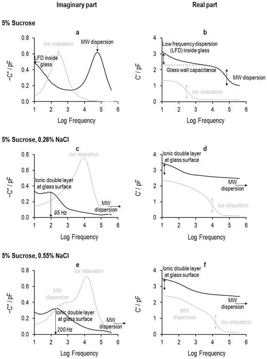 The response from the TVIS vial containing 5% sucrose in the liquid state appears to be quite different from that when the salt is added to the solution; compare the spectra marked by black lines in each real and imaginary plot in Figure 11 (Figure 11a,b are for the pure 5% sucrose solution, and Figure 11c–f are for the 5% sucrose solution with 0.25% and 0.5%). The 5% sucrose solution has a large peak towards the high-frequency end of the imaginary part spectrum and in what appears to be part of another process at the low-frequency end of the spectrum (Figure 11a). The peak in the imaginary part spectrum is mirrored by the step in the real part spectrum (Figure 11b), whereas the salt-loaded solutions have a smaller peak at low frequency that is partially merging with another process at the very low frequency side of this relaxation. These differences are simply because the various relaxation processes occur at different frequencies depending on the physical state and composition of the solutions, as we shall now discuss.