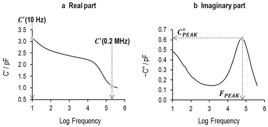 The higher conductivity of the 5% sucrose solution (containing either 0.26% or 0.55% NaCl) causes a dramatic increase in the relaxation frequency of the Maxwell–Wagner process such that the peak in the imaginary capacitance and the step in the real capacitance are positioned out of range of the instrument bandwidth of 10 Hz to 1 MHz. Hence, the Maxwell–Wagner process could not be detected by the TVIS system, as indicated by the black horizontal arrow pointing to higher frequencies in Figure 11c–f.