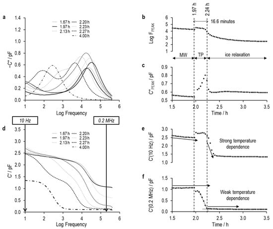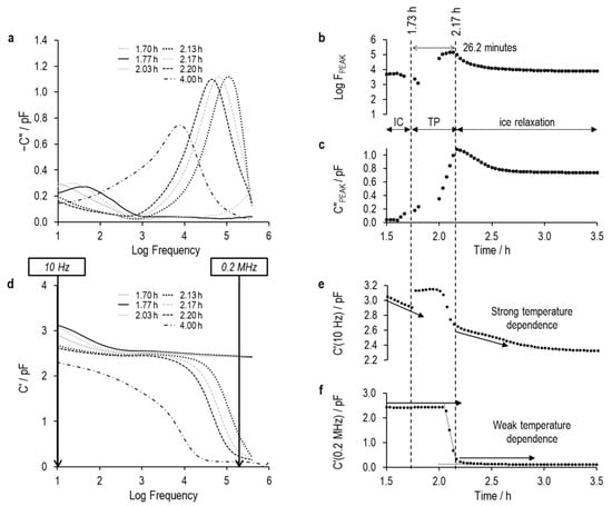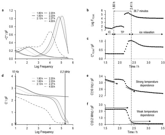 The application of TVIS for determining the characteristics of the ice formation process was first described in [13]. This TVIS approach is based on the transition between two dielectric mechanisms as the liquid changes to a solid. The dielectric process observed for the liquid state is a Maxwell–Wagner (MW) process in which the glass wall of the vial is charged through the solution resistance, whereas the dielectric process observed in the frozen state is due to the relaxation of ice. Those TVIS studies undertaken to date, for the determination of ice formation, have been restricted to water and simple solutions of solutes that have relatively low electrolytic conductivities [14,15,16,17,18]. In the more conductive solutions that would be typically encountered in real product formulations, one would expect the peak of the Maxwell–Wagner process to be on the high frequency side of the experimental frequency range provided by the current TVIS technology (i.e., >1 MHz) and hence ‘out of view’. The determination of the onset of ice nucleation from changes in the dielectric loss peak frequency and/or peak amplitude of the Maxwell–Wagner process ( and , respectively) would not be possible. Instead, there might be opportunities to determine the nucleation onset temperature from tracking the real part capacitance at frequencies on either side of the dielectric relaxation of ice, e.g., 10 Hz and 100 kHz. Our nomenclature for these latter two parameters is and . There is an indication from our previous publication [13] that the high-frequency real part capacitance is useful for the determination of the end of ice formation, given the relative insensitivity of the dielectric permittivity of ice to temperature at these frequencies. Conversely, the low-frequency side of the ice relaxation will be sensitive to temperature changes and hence might prove useful for the determination of the onset of ice formation.