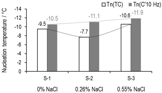 Nucleation temperature of 5% w/v sucrose with either 0% NaCl (S-1), 0.26% NaCl (S-2), or 0.55% NaCl (S-3). The values above the white bars and grey bars indicate the nucleation temperatures from the thermocouple ((TC)) and TVIS technique (()), respectively.