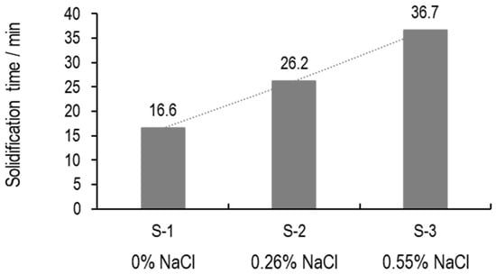In Figure 18, a twofold increase in solidification time is observed as the salt concentration increases from 0 to 0.55% w/v. To explain this result, a basic understanding of ice growth is required. Ice growth involves the addition of water molecules to the solid–liquid interface and is governed by mass transfer through the solution. Water molecules diffuse through the liquid and then adhere to the surface of the growing ice crystal, thereby increasing its size. When sodium chloride is dissolved in water, it dissociates into water molecules and ions, forming a specific ionic interaction. Because the electrostatic bonds between ions and water molecules are stronger than the hydrogen bonds between water molecules [30,31], these water–ion interactions reduce the diffusion rate of water molecules. This reduced mobility effectively hinders the direct participation of water molecules in ice crystal growth. Consequently, the presence of salt delays ice growth, resulting in an increased solidification time.