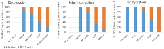 A comparison of subjective assessments of skin discoloration, sebum secretion, and hydration levels showed that the majority of study participants reported significant improvement across all skin features. The comparison of the skin before and after the study is shown in Table 1 and Figure 1.
