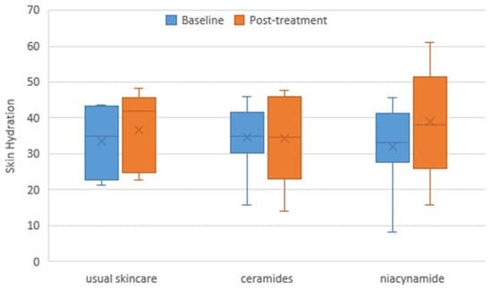 Baseline and post-treatment assessment of hydration shown as a box-and-whisker plot illustrating improvement after treatment (Q1 and Q3 values, min and max values, with whiskers extending up to 1.5 times the interquartile range).