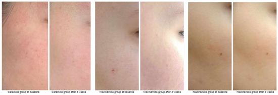 Photographs of the treated skin areas in selected participants who used ceramide-containing and niacinamide-containing preparations.