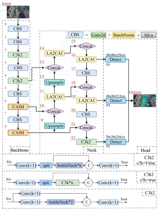 Building upon the core design philosophy of YOLOv12, which centers on attention mechanisms, this paper proposes an improved model tailored for small object detection in drones, named LCW-YOLO, as shown in Figure 2. The model continues to utilize the C3k2 module from YOLOv12 in its backbone network and neck structure. This module is an optimized version of the traditional C3 module, achieved by setting the parameter n = 2 to cascade two C3k modules, thereby further enhancing feature extraction capabilities while improving model runtime efficiency and stability.