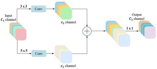 where denotes the intermediate fusion feature, formed by concatenating the input features after processing them with and convolutions; denotes the final output feature; and represent the feature maps processed by the corresponding convolution kernels; denotes the weight of the convolution kernel. Equation (1) implements multi-scale feature extraction and preliminary fusion, while Equation (2) performs cross-channel feature integration and dimension adjustment through convolution.