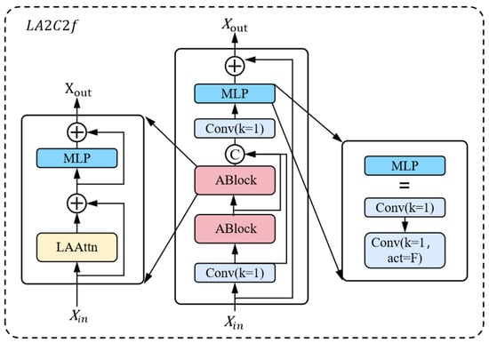 As shown in Figure 4, we propose an improved A2C2f module with lightweight area attention (LAAtn) that applies multi-scale parallel convolution, and achieve efficient feature extraction and fusion through a hierarchical structure. The module first performs channel adjustment via 1 × 1 convolution, followed by two cascaded ABlock units for basic feature extraction. After 1 × 1 convolution adjustment, feature interaction and fusion are achieved through the LAAttn attention mechanism and a multi-layer perceptron (MLP) layer. Finally, through deep feature integration via a MLP layer and two consecutive 1 × 1 convolution layers (with the last layer not using an activation function), the features are refined and dimension-reduced, resulting in an enhanced feature representation. This hierarchical processing architecture preserves shallow-layer spatial detail information while fully leveraging deep-layer semantic features. Through an attention-guided feature fusion mechanism, it significantly enhances the model’s feature expression capabilities.