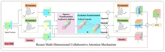 The RMCAM module is an important supplement to the YOLOv12 model backbone. It combines an attention mechanism, incorporating Multi-dimensional Co-operative Attention Mechanism (MCAM) into the YOLOv12 backbone, significantly enhancing the model’s feature extraction capabilities and accuracy. As shown in Figure 5, the attention mechanism models three dimensions: channel, height, and width, with the average value taken from the three-branch output [23]. To mitigate the vanishing gradient problem in deep networks, preserve the original features, and avoid the loss of details caused by excessive focus in traditional attention mechanisms, the residual learning concept from ResNet [24] is adopted. The original input features are directly introduced into the output end of the three attention branches through an identity mapping, forming independent residual paths. The outputs of the three residual branches are concatenated with the original input or adjusted input along the channel dimension, and a 1 × 1 convolution is used to achieve cross-channel information interaction and dimension reduction. Finally, we reference the multi-head attention dynamic fusion strategy from EfficientFormer [25], but adopt a lighter single-layer convolution to reduce computational complexity. The weights of the 1 × 1 convolution can be viewed as a weighted sum of multi-branch features, similar to the soft-hard attention hybrid mechanism in agent attention, enabling the model to dynamically adjust the contribution of each branch based on input content [26]. While reducing the number of parameters, these methods retain feature integration capabilities. The formulas used in these methods are as follows: