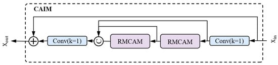 As shown in Figure 6, we designed the CAIM module, which first applies a 1 × 1 convolution to the input features to achieve adaptive compression of the channel dimension and feature space alignment, thereby providing a structured representation for the subsequent attention mechanism. Its output is cascaded into two RMCAM modules, where the convolution-guided local receptive field and the attention-driven global dependency modeling work together. The former captures spatial details, while the latter dynamically calibrates cross-channel semantic weights, forming an iterative feature optimization process. The optimized features are then subjected to a final 1 × 1 convolution for channel fusion and dimension reduction, with the final output being . The entire architecture is centered around a symmetric convolution layer as the core skeleton and a dual attention mechanism as the neural core, achieving precise coupling between local perception and global context. During the feature reconstruction process, it simultaneously enhances detail retention and semantic focus capabilities.