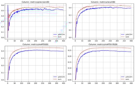 The experimental results in Figure 7 show that the improved model achieves significant improvements over the baseline model in the drone small object detection task. As the number of training iterations increases, the model’s bounding box loss (train/box_loss), validation set bounding box loss (val/box_loss), and classification loss (val/cls_loss) all exhibit a continuous downward trend, fully demonstrating the model’s excellent parameter optimization capabilities and stable convergence characteristics. As shown in Figure 8, the average accuracy rate (mAP@0.5) across all categories reached 44.7%, an improvement of 3.3% over the baseline model’s 41.4%. This improvement is particularly significant in key small object categories, where bicycle detection accuracy increased from 16.5% to 18.6%, tricycle detection accuracy increased from 29.0% to 34.0%, and tricycle detection coverage accuracy increased from 14.5% to 17.3%. The model’s accuracy, recall, and mAP metrics have all improved. This indicates that the model can learn more refined features from the training data, thereby reducing errors and improving detection performance.