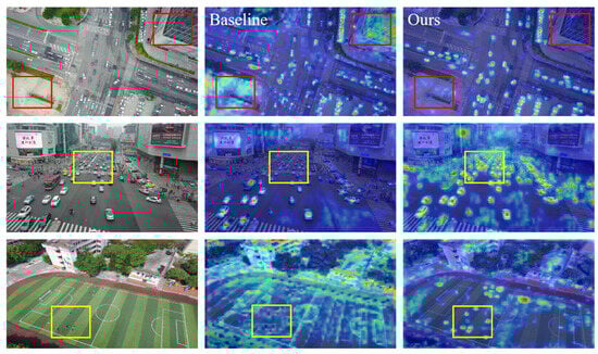 As shown in Figure 9, heatmaps for YOLOv12m and LCW-YOLO were generated based on the VisDrone2019 dataset, highlighting the backpropagation performed through bounding box predictions. Notably, compared to the baseline model, LCW-YOLO demonstrates a significant improvement in locating small targets. The heatmaps generated by our model show that small objects are assigned higher heat values, indicating enhanced capability in capturing these object features. Additionally, the model appears to place greater emphasis on contextual information around these small objects, reflecting its ability to leverage surrounding details during detection. The areas highlighted in yellow in the figure demonstrate the model’s proficiency in detecting partially occluded objects. Thus, our model does not compromise the real-time performance of the baseline model. In fact, as shown in Table 7, we evaluated the frames per second (FPS) and average power consumption of the YOLOv12m model and our LCW-YOLO model using 32-bit floating-point precision implemented with PyTorch. The results demonstrate that LCW-YOLO not only effectively preserves the real-time performance characteristics of YOLOv12m but also reduces average power consumption by 14%, which is crucial for persistent drone missions with limited battery capacity. The results indicate that LCW-YOLO effectively retains the real-time performance characteristics of YOLOv12m. After deployment on different hardware platforms, improvements in frame rate (FPS) can be observed [48].