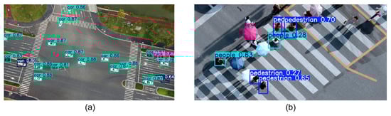 To validate the practical applicability of the proposed method, we deployed the model on a drone platform. Using an onboard camera, we captured real-time video streams for target detection and transmitted results back to the ground station. Test data was collected from diverse traffic road scenarios, featuring numerous small-scale targets and partially occluded objects, posing significant challenges to the model’s inference capabilities. Real-time inference results are shown in Figure 12. Figure 12a demonstrates the model’s detection performance on moving vehicles, while Figure 12b presents detection results for moving pedestrians. Experimental results indicate that even in complex real-world scenarios, the proposed method exhibits robust detection performance and robustness.
