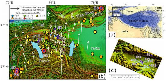 The Pamir–Western Himalayan Syntaxis marks the western terminus of the Indo-Asian collision zone (Figure 1a). This syntaxis is bounded to the north by the Main Pamir Thrust and to the south by the Main Boundary Thrust and Main Frontal Thrust [36]. The eastern boundary is defined by the approximately 1000 km long right-lateral Karakoram fault, which extends from eastern Pamir to southwestern Tibet [37,38]. Tectonic studies, including GPS velocity fields and focal mechanism solutions, indicate intense compressional shortening along the northern and western edges of Pamir (Figure 1b) [39]. In contrast, central and western Pamir are separated from eastern Pamir by the 205 km long Kongur Shan extensional system, which accommodated east–west extension in northern Pamir, together with Karakul Rift in central–northern Pamir [40,41].