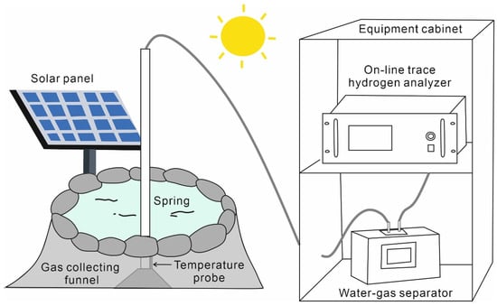 The main components of the online monitoring system for hydrogen concentration in spring gases are shown in Figure 2. A custom-made polytetrafluoroethylene gas collection funnel is inverted and positioned over the spring outlet to capture gas emissions. The funnel outlet is connected to a high-efficiency water–gas separator via a flexible hose, which subsequently connects to the inlet of a trace hydrogen online analyzer. This analyzer is equipped with temperature and pressure sensors, allowing for the hourly recording of ambient temperature and atmospheric pressure. A water temperature probe is installed above the funnel. The entire system is powered by solar energy, and data transmission is achieved via 4G wireless communication. The trace hydrogen analyzer has a measurement range of 0–5000 ppm, a detection limit of ≤0.005 ppm, and an average relative standard deviation (RSD) of ≤5%. The water temperature probe operates within a range of 0–100 °C, with a resolution of 0.06 °C and an accuracy of 0.3 °C. Both hydrogen concentration and water temperature are measured on an hourly basis.