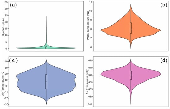 Violin plots showing the distribution of data for different variables: (a) H2 concentration, (b) water temperature, (c) air temperature, and (d) air pressure. The shape of each violin plot is determined using kernel density estimation. The box part of each plot is bounded by the upper and lower quartiles, with the central horizontal line representing the median. The whiskers extend from the edges of the box to 1.5 times the interquartile range, capturing potential outliers.