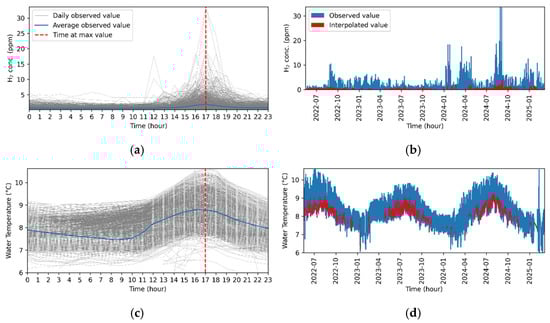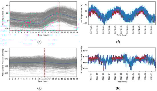 (a,c,e,g) show the 24 h variation curves of H2 concentration, spring water temperature, air temperature, and atmospheric pressure, respectively. The gray lines indicate daily fluctuations, the blue lines represent the average of valid data, and the red dashed lines highlight the times corresponding to the daily peaks. (b,d,f,h) display the hourly variations in these parameters over the entire observation period, with the blue lines representing actual observations and the red lines showing values interpolated using a seasonal method.