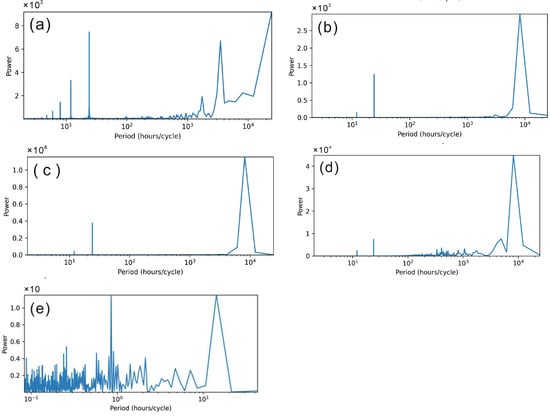 FFT periodogram of (a) H2 concentrations, (b) water temperature, (c) air temperature, (d) air pressure, and (e) precipitation.