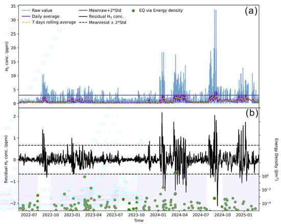 (a) Temporal variation in raw H2 concentration, shown with 24 h and 7-day rolling averages; “Meanraw+2 * Std” indicates the mean plus two standard deviations (2.98 ppm). (b) Residual H2 concentration calculated using Eq. (4), with thresholds defined by ± 2σ; “Meanresid ± 2 * Std” represents the mean ± two standard deviations. The scatter plot (green dots) displays seismic events with energy density > 10−5 J/m3 at the observation point. Purple shaded areas mark time intervals of intensive seismic activity.