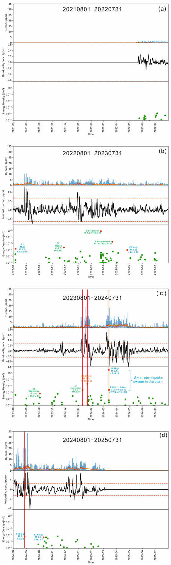 To better visualize the segmented characteristics, Figure 6 is divided into subplots, as shown in Figure 7: Figure 7b,c represent two complete periods, including both seismic quiescence and seismic activity intervals, from August 1, 2022 to July 31, 2023 and from August 1, 2023 to July 31, 2024. Figure 7a,d present data from before July 31, 2022 and after August 1, 2024. To make the x-axis time lengths of these two segments comparable to those in Figure 7b,c, the horizontal axes were extended to August 1, 2021 and July 31, 2025, respectively, with empty observation values. A vertical comparison of Figure 7a–d shows that (1) during June–July, seismic activity was weak, and H2 continued to be released at low concentrations; (2) during August–September, seismic activity was low, but short-term (approximately 15 days), high-intensity H2 release was observed during seismic quiescence periods, a phenomenon seen in two of the three segments (Figure 7b,d); and (3) from October to May, seismic activity was intense, and H2 release was strong, especially during January–March, further amplified by special seismic events (discussed in the next section).