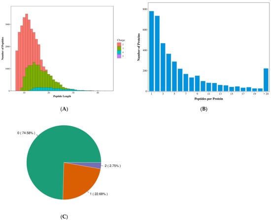 As shown in Figure 1, the majority of peptides were distributed within the range of 7–20 amino acids. This distribution is consistent with the general patterns observed for tryptic digestion followed by mass spectrometry fragmentation, indicating that the length distribution of the peptides identified by mass spectrometry meets quality control requirements (Figure 1A,B). The peptide count distribution was evenly spread. Peptides with zero missed cleavage sites accounted for 74.58% of the total, demonstrating complete enzymatic digestion, which is beneficial for identification (Figure 1C).
