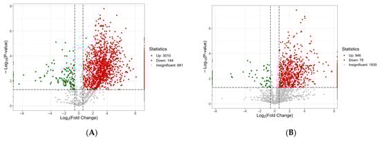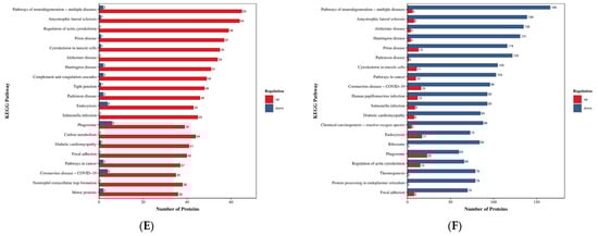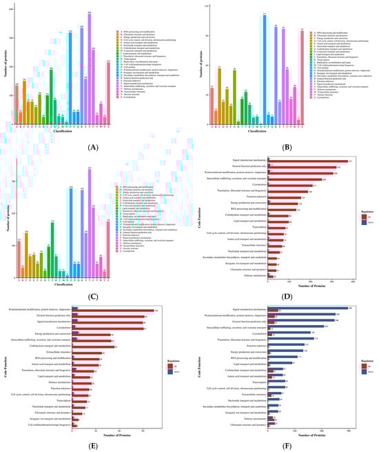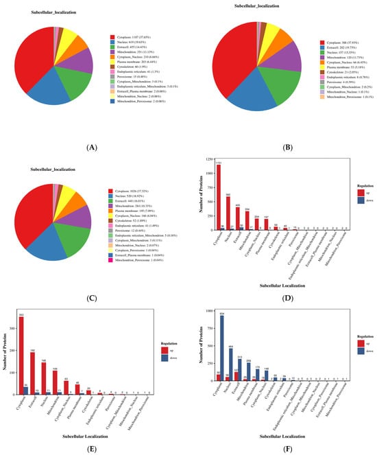 As shown in Figure 11, a total of 3153 differentially expressed proteins (DEPs) in subcellular structures were annotated for Group A, which were localized across 14 entries; the top three subcellular compartments by localization proportion were the cytoplasm (1187 proteins, comprising 1156 upregulated and 36 downregulated proteins), the nucleus (619 proteins, comprising 592 upregulated and 27 downregulated proteins), and the extracellular space (455 proteins, comprising 405 upregulated and 50 downregulated proteins) (Figure 11A,D).