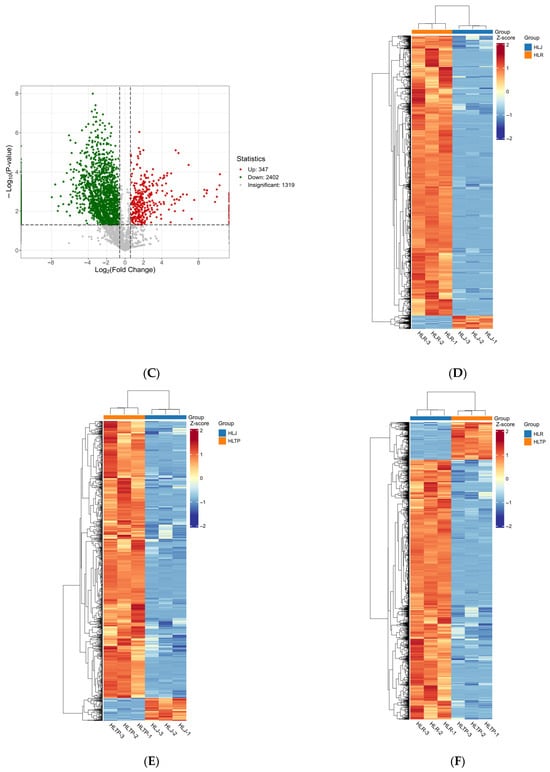 Screening results of differentially expressed proteins. (A–C) Volcanic diagram of differentially expressed proteins. Note: The x-axis represents the log2-transformed fold change, the y-axis represents the -log10-transformed p-value, and the red and green scatter points denote the upregulated and downregulated differentially expressed proteins, respectively. (D–F) differential expression protein clustering heatmap. Note: Rows represent differentially expressed proteins, columns represent samples, and shorter dendrogram branches indicate higher similarity. (A,D) HLR vs. HLJ; (B,E) HLTP vs. HLJ; (C,F) HLTP vs. HLR.