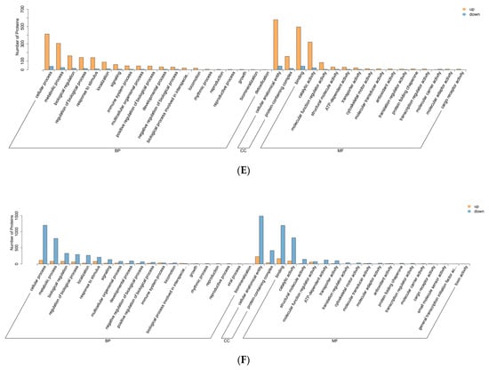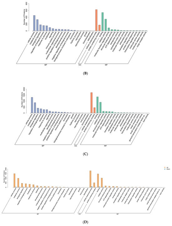 Since DEPs in Groups A and B were predominantly upregulated, while those in Group C were predominantly downregulated, the GO annotation bar charts for upregulated and downregulated DEPs are consistent with the annotations for the total DEPs (Figure 3D–F).