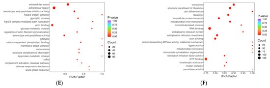 Cellular Component (Bubble Chart): Group A DEPs displayed distinct coloration (e.g., red) and moderate size for points associated with cytoplasm and ribosome, indicating significant enrichment in these components (Figure 4D). Group B DEPs exhibited points positioned towards the right (high enrichment fold) with distinct coloration (e.g., red) for extracellular region-related terms, indicating high enrichment and statistical significance within these components (Figure 4E).