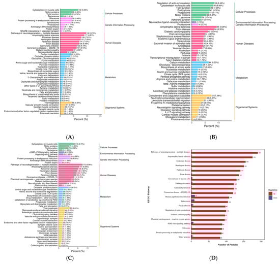 In cellular processes, Group A DEPs were primarily involved in pathways, including cytoskeleton in muscle cells, motor proteins, Tight junction, and Peroxisome, while Group B DEPs were significantly enriched in pathways such as regulation of actin cytoskeleton, Endocytosis, and Phagosome (Figure 5A,B). Regarding genetic information processing, Group A DEPs were concentrated in the ribosome, protein processing in endoplasmic reticulum, and proteasome pathways, whereas the DEPs of deer antler base specifically participated in proteasome-related pathways. Metabolic pathway analysis revealed that Group A DEPs were significantly enriched in glycolysis/gluconeogenesis, oxidative phosphorylation, and Pyruvate metabolism (Figure 5A), while deer antler base participated in metabolic regulation via the TCA cycle (tricarboxylic acid cycle) and biosynthesis of amino acids pathways (Figure 5B,C). Significant enrichment in pathways related to neurodegenerative diseases (pathways of neurodegeneration–multiple diseases) was observed across all three groups. Antler velvet exhibited specific regulatory roles in the Alzheimer disease, Huntington disease, and Parkinson disease pathways, suggesting its potential therapeutic intervention value and further supporting the clinical application value of deer antler-derived medicinal materials (Figure 5A–C). Conversely, the DEPs of deer antler base demonstrated unique activity in the amyotrophic lateral sclerosis (ALS) and Carbon metabolism pathways (Figure 5E,F). In the regulation of organic systems, antler velvet DEPs were mainly involved in Thermogenesis and cardiac muscle contraction (Figure 5D,F), while deer antler base DEPs exerted immunomodulatory functions through pathways such as complement and coagulation cascades and neutrophil extracellular trap (NET) formation (Figure 5E,F). The results indicate that the specific enrichment of antler velvet DEPs in the ribosome and protein processing in endoplasmic reticulum pathways was significantly higher than that of deer antler base, thereby strengthening the molecular basis for its pharmacological activity.