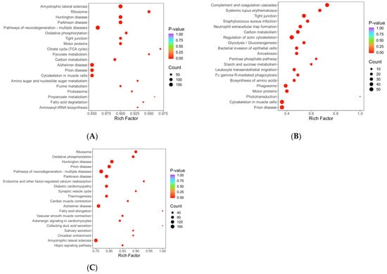 Bubble diagram of KEGG enrichment analysis. Note: The x-axis represents the fold enrichment (calculated as the ratio of enriched differentially expressed proteins to annotated proteins in each term), with higher values indicating greater enrichment significance. The y-axis displays the KEGG pathways. A gradient color scheme from blue to red corresponds to decreasing p-values, where smaller values denote enhanced statistical significance. The size of the data points reflects the number of differentially expressed proteins annotated to each corresponding functional category. (A) HLR vs. HLJ; (B) HLTP vs. HLJ; (C) HLTP vs. HLR.
