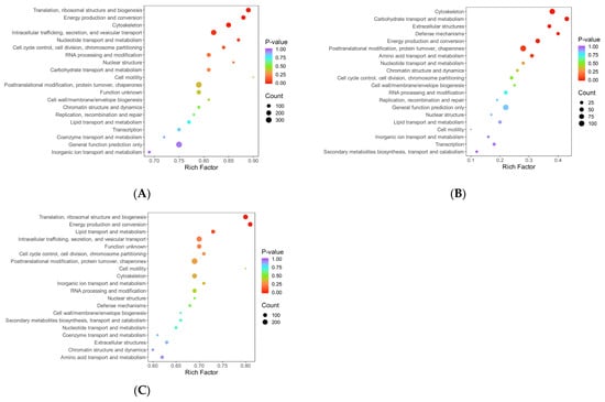 Bubble diagram of KOG enrichment analysis. Note: The x-axis represents the fold enrichment (calculated as the ratio of the number of differentially expressed proteins enriched in a specific term to the number of annotated proteins), with higher values indicating greater enrichment of differentially expressed proteins. The y-axis displays the KOG functional descriptions. The color gradient from blue to red corresponds to decreasing p-values, where smaller p-values indicate greater statistical significance. The size of the data points reflects the number of differentially expressed proteins annotated to each corresponding functional category. (A) HLR vs. HLJ; (B) HLTP vs. HLJ; (C) HLTP vs. HLR.