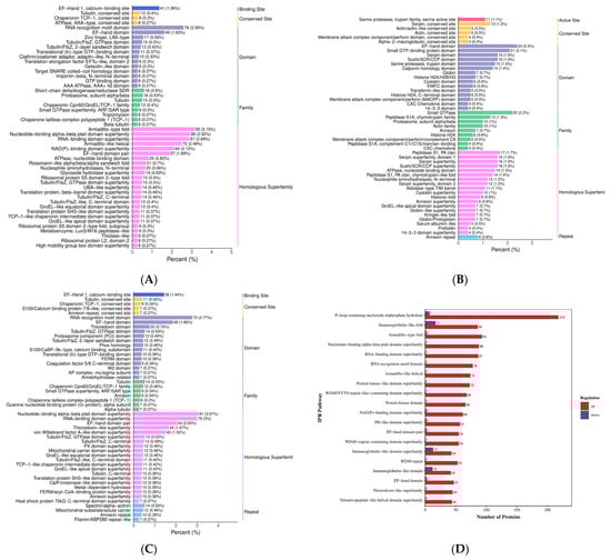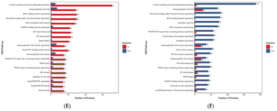 Group A DEPs were predominantly enriched in the EF-Hand 1 calcium-binding site (Binding Site), Tubulin conserved site (Tubulin, conserved site), and RNA recognition motif domain (RNA recognition motif domain); notably, the P-loop containing nucleoside triphosphate hydrolase (P-loop containing nucleoside triphosphate hydrolase) domain had the largest number of upregulated proteins (218 proteins), with significant enrichment also observed for the Immunoglobulin-like fold (Immunoglobulin-like fold) and Armadillo-type fold (Armadillo-type fold), suggesting enhanced activities in nucleotide metabolism, immune regulation, and protein kinase activity (Figure 9A,D). In contrast, Group B DEPs showed specific enrichment in Serine proteases, trypsin family active sites (Serine proteases, trypsin family) and Serpin (Serpin) domains; the activation of the P-loop domain (71 upregulated proteins) and the RNA-binding domain superfamily (RNA-binding domain superfamily) highlighted the enhancement of proteolytic and RNA processing functions (Figure 9B,E).