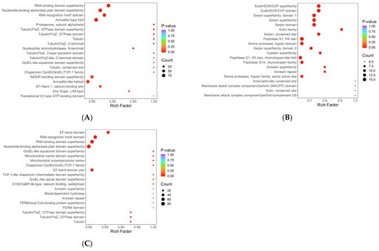 Bubble plot for domain enrichment analysis. Note: The x-axis represents the fold enrichment (calculated as the ratio of enriched differentially expressed proteins to annotated proteins for each entry), with higher values indicating greater enrichment significance. The y-axis displays the InterPro (IPR) entry descriptions. A blue-to-red color gradient corresponds to decreasing p-values, where smaller values denote enhanced statistical significance. The size of the data points is proportional to the number of differentially expressed proteins annotated to each corresponding functional entry. (A) HLR vs. HLJ; (B) HLTP vs. HLJ; (C) HLTP vs. HLR.