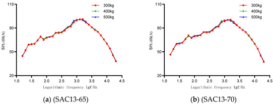 The results show that the noise level is not sensitive to vehicles with different axle weights. From the sound pressure level of 300 kg to 500 kg, the noise level of the same surface layer material under different axle loads is roughly the same (see Figure 7). One possible reason is that within this axle weight range, the difference in the contact state between the tire and the road is very small.