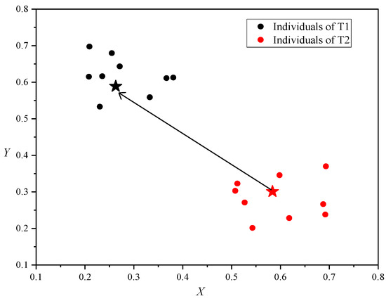 Although these EMTO algorithms have achieved success to some degree, they often involve two limitations. First, almost all these EMTO algorithms do not consider the distribution information of populations and only use the fixed KT frequency when performing KT, such as the fixed random mating probability (rmp) used in MFEA and MFEA–AKT. If we can fully utilize the distribution information of tasks, the similarity of tasks can be effectively evaluated, which can further facilitate the adjustment of KT frequency. Second, many EMTO algorithms often directly transfer individuals from source task to target task, such as AEMTO, which cannot guarantee the quality of the transferred information, causing insufficient or even negative KT. For example, in Figure 1, the individuals of target task T1 and source task T2 are marked in black and red, respectively, and the stars denote the global best solutions of the two tasks. During the evolutionary process, the individuals of the two tasks will be gradually separated in the search space. If the individuals from source task T2 are directly transferred to target task T1, the transferred individuals may be useless for target task T1 due to such distinct distributions. On the contrary, if a suitable map between target task T1 and source task T2 can be designed, when KT occurs, the individuals in source task T2 can be mapped into the suitable solutions for target task T1; consequently, the transferred information will be more useful and the KT process will be more effective.