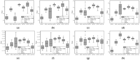 The boxplots of APMTO and the compared algorithms on CEC2022. (a) Benchmark3-T1; (b) Benchmark3-T2; (c) Benchmark6-T1; (d) Benchmark6-T2; (e) Benchmark7-T1; (f) Benchmark7-T2; (g) Benchmark10-T1; (h) Benchmark10-T2.