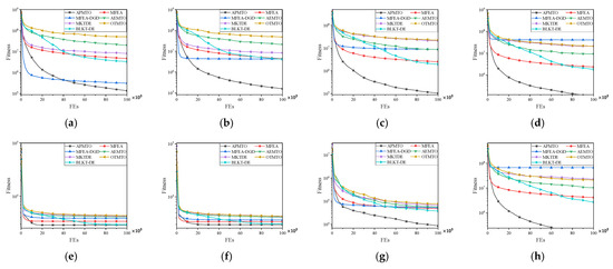 Furthermore, to illustrate the convergence behavior of APMTO, we plot the convergence curves of APMTO and all these compared algorithms on eight representative tasks in Figure 4. First, in Figure 4e,f, we find that APMTO reveals the rapid speed in Benchmark7–T1 and Benchmark7–T2, while only BLKT–DE can show the comparable search behavior with APMTO, and other EMTO algorithms evolve much slower. Nonetheless, APMTO still obtains the most accurate solutions in the two tasks. Then, from Figure 4a,b,g, although APMTO is surpassed by MFEA-DGD temporarily at the early stages, APMTO finally accelerates in the later stages of the evolution and still achieves the most satisfying solutions in Benchmark3–T1, Benchmark3–T2, and Benchmark10-T1. Next, as shown in Figure 4c,d,h, the performance of both MFEA-DGD and BLKT-DE degrades while APMTO exhibits the fastest speed during the whole evolution process in Benchmark6–T1, Benchmark6–T2, and Benchmark10–T2.
