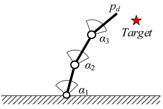 To further reveal the applicability of APTMO, we apply APMTO to a real-world multitask application planar kinematic arm control problems (PKACP). An example of a three-dimensional PKACP is shown in Figure 5. The objective of each arm is to optimize the angles of each joint in the arm, so that the tip of the arm P can approximate the target position T, i.e., minimize the distance between the end-effector of the arm P and the target position T. Herein, D represents the number of joints and links of the arm, and the angle is denoted as α. Each PKACP is a minimization problem with D decision variables α1, α2, …, αD, and the objective function is defined as follows: