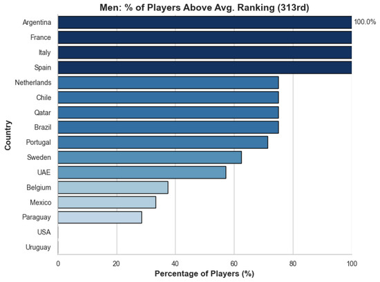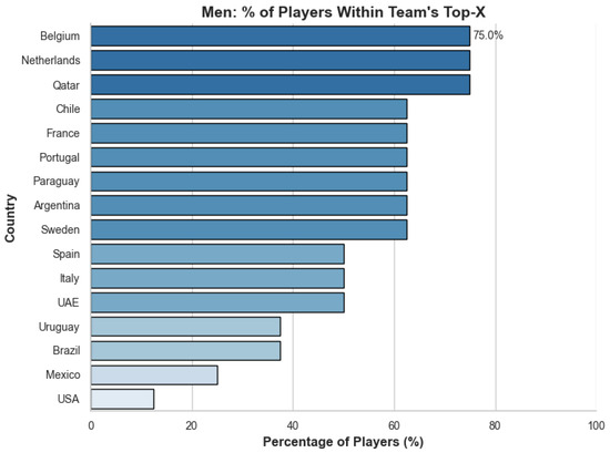 For men’s teams (Figure 3), countries such as Belgium, The Netherlands, and Qatar had a high proportion of players within their Top-X ranking, suggesting that their teams were internally well-balanced in terms of ranking distribution. However, these teams had fewer players ranked above the competition-wide average, indicating that, while balanced, they may have lacked truly elite players capable of outperforming the top nations.