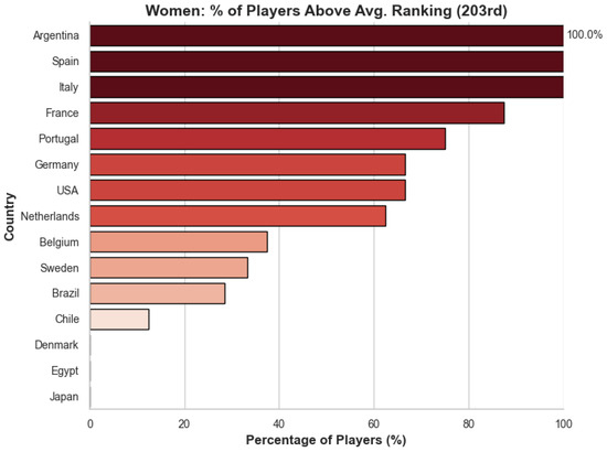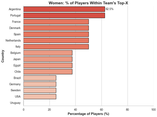 For women’s teams (Figure 4), Portugal and Argentina had the highest proportion of players within their respective Top-X threshold, indicating a structured and balanced selection approach. However, the USA, Sweden, Germany and Brazil had a lower proportion of players within their Top-X, which could imply a wider range of ranking levels within their squads or a selection strategy focusing on a few highly ranked individuals.