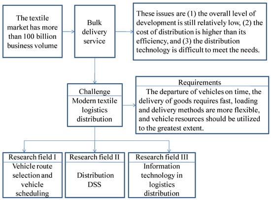 Due to the complexities of vehicle loading and vehicle resource recycling, distribution DSSs for textile logistics are still relatively rare. In academic circles, domestic and foreign scholars’ research on logistics distribution mainly focuses on three fields: vehicle route selection and vehicle scheduling, distribution DSSs, and the application of information technology in logistics distribution.