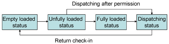 (1) Vehicle status management criteria: In the distribution task, the total number of vehicles is set to n, and the vehicles are sorted and serial-numbered according to the order of tonnage from large to small, expressed by a tuple as , . Here, is the vehicle serial number, indicates the tonnage of the vehicle, indicates the status of the vehicle, , and the vehicle statuses are divided into four types: empty status (), not fully loaded status (), fully loaded status (), and dispatching status (). indicates that the vehicle is owned, and indicates that the vehicle is non-owned (external vehicle). The serialization of vehicles in this way is called the vehicle status management criteria. The changes of vehicle usage status are shown in Figure 4 below: