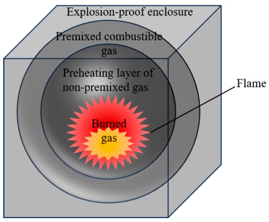 A gas explosion is a rapid combustion phenomenon triggered by an ignition source. Intense chemical reactions occur at the interface between the combustible gas and the unburned gas, resulting in the transformation of matter and energy. The most prominent physical characteristics of an explosion include high temperature, high pressure, and combustion flames. When a combustible gas is uniformly premixed with air and its concentration falls within the explosive limit range, its explosion and combustion behavior can be described by the physical model shown in