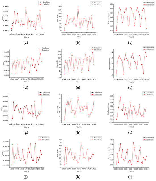 Simulation and prediction curves of each sample point (a) Sample point 1 strain curve (b) Sample point 1 stress curve (c) Sample point 1 displacement curve (d) Sample point 2 strain curve (e) Sample point 2 stress curve (f) Sample point 2 displacement curve (g) Sample point 3 strain curve (h) Sample point 3 stress curve (i) Sample point 3 displacement curve (j) Sample point 3 strain curve (k) Sample point 4 stress curve (l) Sample point 4 displacement curve.