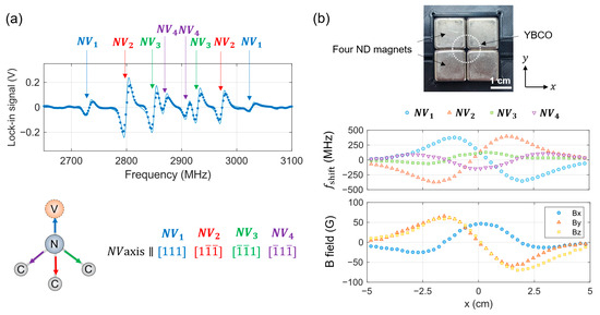 Vector magnetometry using four NV orientations. (a) Lock-in detection of the ODMR spectrum reveals four pairs of NV spin resonances, corresponding to the four crystallographic orientations of NV centers in the diamond lattice. The bottom panel illustrates the diamond crystal structure and the four possible NV axes. (b) Top: photograph of the four Nd magnets. The dashed circle marks the size and position of the YBCO disk on top of the magnets. Middle: frequency shifts () of the four NV orientations as the magnetometer scans along the x-axis over the magnets. The coordinate (x, y) = (0, 0) corresponds to the center of the Nd magnet array. Bottom: 3D magnetic field components (, , and ) reconstructed from the frequency shift data shown in the middle panel.