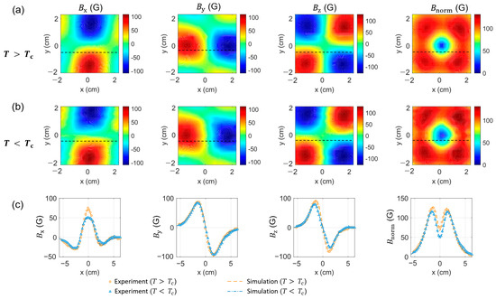 We also performed magnetic simulations using COMSOL Multiphysics 5.4. The model incorporated the magnetic properties of Nd, the sample-sensor separation h = 1.7 cm, and the superconducting properties of YBCO (assuming perfect diamagnetism below ). The simulation results closely match the experimental data, as indicated by the dashed and dot-dashed curves in Figure 3c.