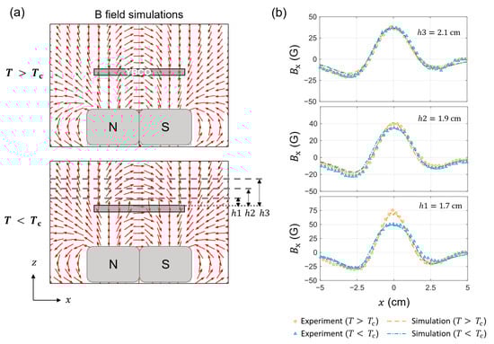 Magnetic field profiles at various heights from the YBCO disk. (a) Simulated magnetic field profiles from the Nd magnets when the YBCO disk is at (top) and (bottom), showing the expected field distribution with and without the Meissner effect. (b) Experimental measurements of the components at three different heights above the YBCO surface: h1 = 1.7 cm, h2 = 1.9 cm, and h3 = 2.1 cm, as shown in (a). Circular and triangular makers represent data at and , respectively. Dashed and dot-dashed curves are corresponding simulation results.